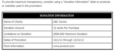 The Guidance states that advertisements and web sites used in the cause marketing campaign, and product packaging, should “clearly and prominently” disclose the terms of the promotion, including the charity’s name, what the charity will receive, what the consumer needs to do, whether there are any minimum or maximum amounts guaranteed to be paid to the charity, and the start and end dates of the cause marketing campaign. The Guidance provides an example: